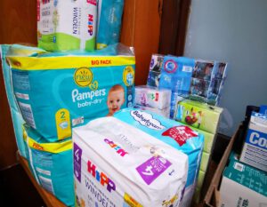 Spenden von Windeln. Babyhygiene Artikel und trockene Originalverpackte Lebensmittel wie Reis, Nudeln, Kaffee, Zucker werden  jedoch auch weiterhin benötigt